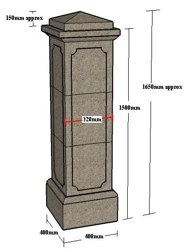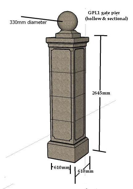GPEL1 sectional gate pier at 2830mm height, this sketch shows a Ball finialon top but can be changed for any of our standard pier cap products.